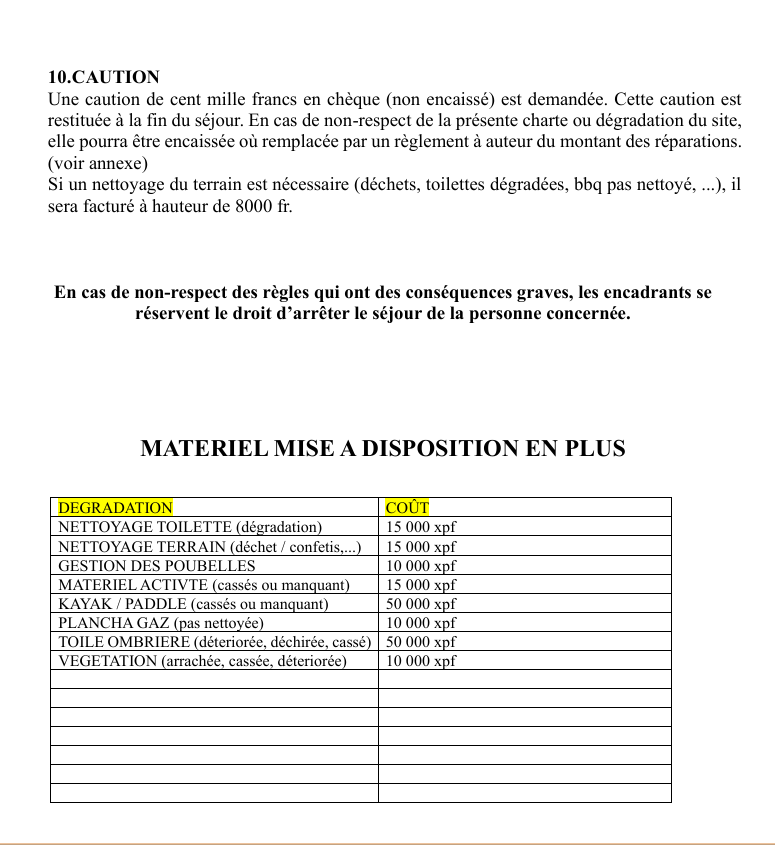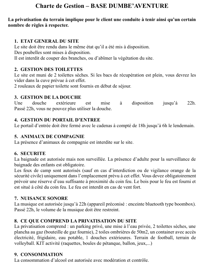 Lire la charte de gestion & d'utilisation de la base en réservant pour approuvez celle-ci. Un état des lieux sera fait après votre sortie mais avant de quiter le terrain merci de prendre des photos du terrain par vous même.